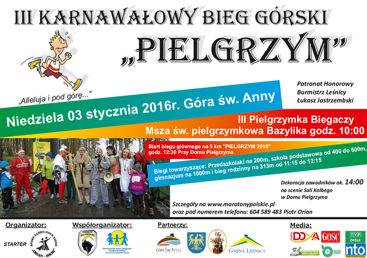 Pielgrzymka Biegaczy na Górę św. Anny i III Karnawałowy Bieg Górski "Pielgrzym" odbędą się w niedzielę 3 stycznia. Msza św. w annogórskiej bazylice rozpocznie się o 10.00. A od 11.15 przy Domu Pielgrzyma rozpoczną się pierwsze starty dla biegaczy. Kolejno pobiegną przedszkolaki (na dystansie 313 m), dzieci ze szkół podstawowych (600 m) i młodzież gimnazjalna (1400 m). Odbędzie się również bieg rodzinny.