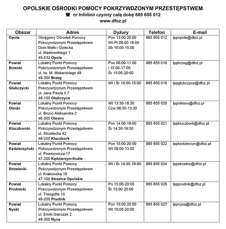 Projekt, którego celem jest przeciwdziałanie skutkom zaistniałych przestępstw, realizowany jest w 9 miejscowościach województwa opolskiego (w Brzegu, Głubczycach, Kędzierzynie-Koźlu, Kluczborku, Nysie, Oleśnie, Opolu, Prudniku i Strzelcach Opolskich), gdzie dwa razy w tygodniu, w określonych dniach dyżurują osoby pierwszego kontaktu. Umawiać można się telefonicznie. Infolinia 885 655 012 czynna jest całodobowo przez 7 dni w tygodniu.