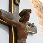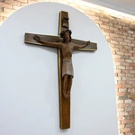 W centrum kaplicy - w zamyśle Pauliny Burzyńskiej-Otkały, która ją projektowała - miał znaleźć się krzyż, który będzie nam przypominać o miłości Boga i który będzie nas przenosić od tajemnicy wcielenia Syna Bożego do tajemnicy odkupienia. Pierwotnie myśleliśmy o krzyżu metalowym, ale kiedy pojechaliśmy do Częstochowy i w sklepie ze starymi sakralnymi rzeźbami zobaczyliśmy właśnie ten drewniany, pomyśleliśmy, że bardzo pasowałby do naszego domu. Wprawdzie nie był wtedy w takim stanie, jak widzimy go teraz, ale zdecydowaliśmy się go kupić i poddać renowacji. Nie znamy jego historii, przypuszczamy, że pochodzi z zamkniętej kaplicy bądź kościoła w Niemczech. Jest to bardzo wymowne przedstawienie Ukrzyżowanego. Wydaje się, że Jego ręce chcą nas objąć, ale nie mogą, bo są przybite do belki krzyża. Pan Jezus jest żyjący, patrzący na nas z troską. Wierzę, że ta troska będzie się wyrażała w wielkich łaskach, jakie będzie nam zsyłał w tym miejscu.