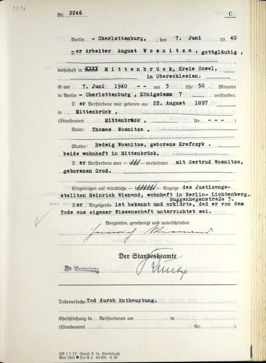 August Woznica, robotnik pochodzący z Raszowej (dekanat Leśnica), ur. w 1897 r., mąż Gertrudy (z domu Gross), syn Thomasa i Hedwig (z domu Krafczyk), 7 czerwca 1940 r. został ścięty gilotyną w berlińskim więzieniu Plötzensee. 3 maja 1940 r. wyrokiem Sądu Wojskowego Rzeszy w Berlinie został skazany na śmierć. W Księdze Zmarłych Miejsca Pamięci Plötzensee (utworzonego na miejscu części dawnego więzienia, a dokładniej w baraku, gdzie znajdowała się gilotyna i uśmiercano skazanych) o Auguście Wosnizty (w tym miejscu stosuję się do pisowni niemieckich dokumentów, na pomniku ofiar II wojny światowej w Raszowej nazwisko jest zapisane jako "Woznica" i tego zapisu się trzymam w dalszym ciągu tekstu) zapisano słowa, które nie dają mi spać: Nach Beginn des Zeiten Weltkrieges wird er zur Wehrmacht einberufen und verweigert aus religiösen Gründen den Dienst an der Waffe und den Eid auf Hitler - "Po wybuchu II wojny światowej został powołany do Wehrmachtu i z powodów religijnych odmówił służby w wojsku i złożenia przysięgi wierności Hitlerowi".