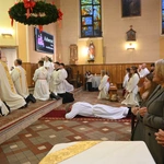 Jedną z części obrzędu jest odśpiewanie Litanii do Wszystkich Świętych. Wyświęcany na znak pokory leży w tym czasie na posadzce świątyni.